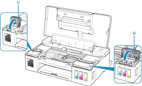 Kun täytät värillisen musteen mustesäiliöitä, avaa oikeanpuoleisen mustesäiliön kansi (D).