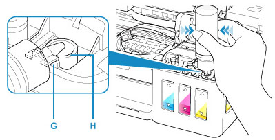 Kohdista mustepullon nokka pullon ohjaimeen (G) tulostimessa, työnnä nokka tuloon (H).