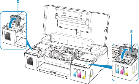 5. Zorg dat de kleppen over de inkttank (D) (E) zijn geopend.