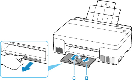 Húzza ki a papírgyűjtő tálcát (B) és a papírgyűjtő tálca hosszabbítóját (C).