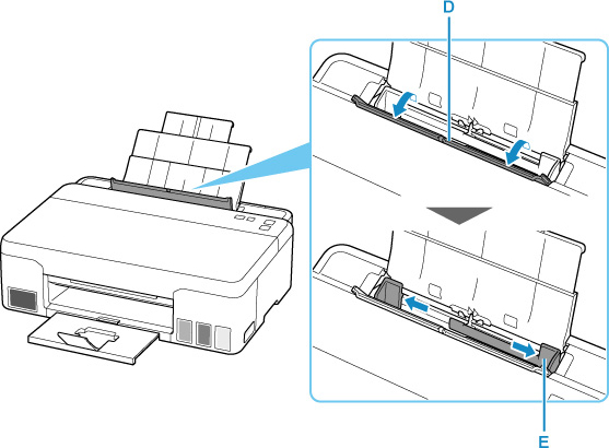 A jobb oldali papírvezetőt (E) eltolva nyissa szét a két papírvezetőt.