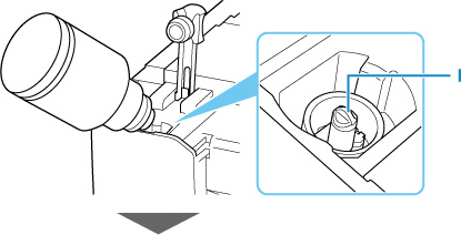 Igazítsa a tintaflakon hegyét a bemenetbe (I), lassan állítsa fel a flakont, hogy fejjel lefelé nézzen, és nyomja be a flakont a bemenetbe.