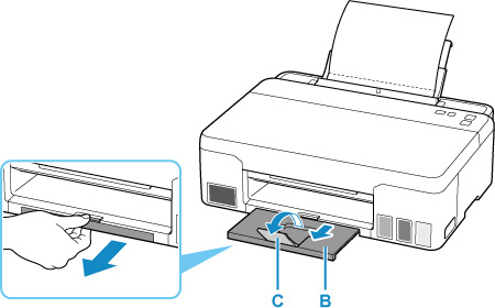 4. Húzza ki a papírgyűjtő tálcát (B), majd nyissa ki a papírgyűjtő tálca hosszabbítóját (C).