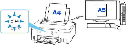 Hvis f.eks. indstillingen for papirstørrelse til udskrivning er A5, og indstillingen for papirstørrelse er angivet til A4 på printeren, begynder printeren at udskrive i A5 på det ilagte papir.