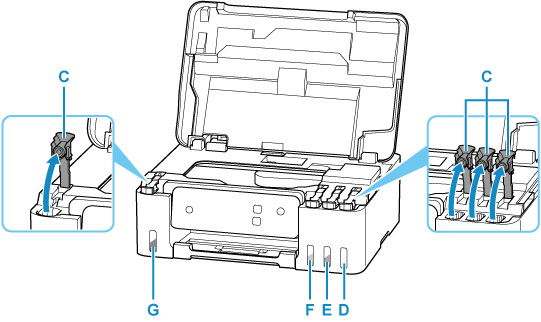 3. Abra la tapa del depósito (C) del depósito de tinta que desea rellenar.