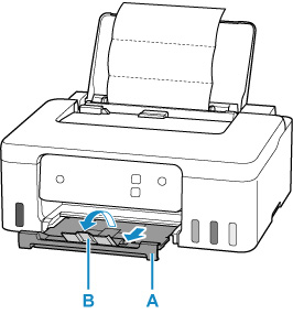 Wyciągnij tacę wyprowadzania papieru (A) i otwórz przedłużenie tacy wyjściowej (B).