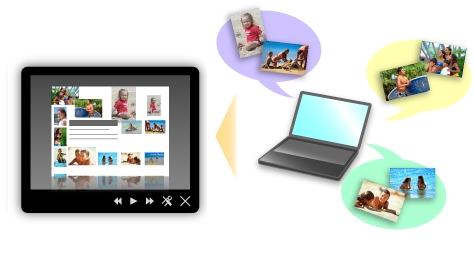 وفقًا للمعلومات المسجلة على الصور، تقوم Quick Menu تلقائيًا بتحديد الصور على جهاز الكمبيوتر وإنشاء عناصر موصى بها مثل الملصقات والبطاقات. تظهر العناصر الذي تم إنشاؤها في عرض شرائح.