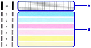 Check if there are missing lines in pattern A or horizontal white streaks in pattern B.