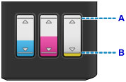 Quando a tinta estiver próxima à linha de limite inferior (B), a tinta estará acabando. Recarregue o cartucho de tinta.