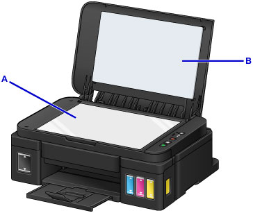 Gebruik een zachte, schone, pluisvrije en droge doek. Veeg de glasplaat (A) en de binnenzijde van de documentklep (witte plaat) (B) voorzichtig af. Zorg dat er geen restanten achterblijven, vooral niet op de glasplaat.