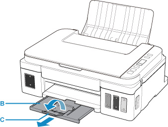 Trek de papieruitvoerlade (B) uit en open het verlengstuk van de uitvoerlade (C).