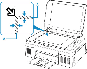 De printer kan het gestreepte gedeelte (A) (1 mm (0,04 inch) vanaf de randen van de glasplaat) niet scannen.