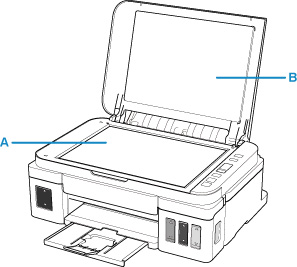 Veeg de glasplaat (A) en de binnenkant van de documentklep (witte plaat) (B) voorzichtig af met een schone, zachte, pluisvrije en droge doek. Zorg dat er geen restanten achterblijven, vooral niet op de glasplaat.
