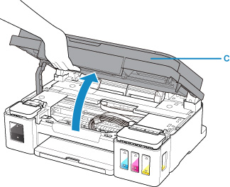 Уверете се, че сте отворили капаците на резервоарите за мастило (D)(E).