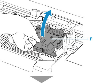 Стиснете езичетата и отворете застопоряващия капак на печатащата глава (F).