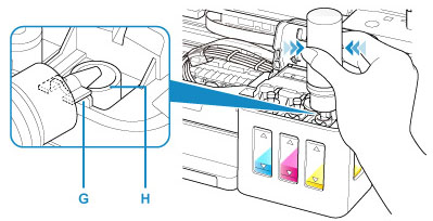 Като подравните накрайника на бутилката с мастило с водача за бутилка (G) на принтера, пъхнете накрайника във входа (H).
