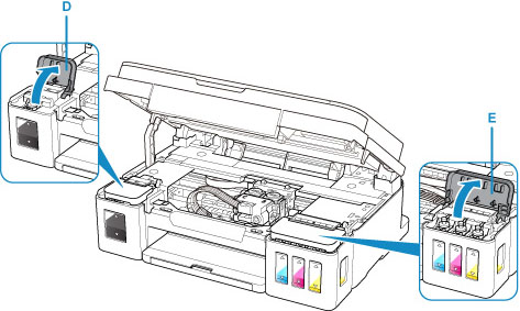 Zorg dat de kleppen over de inkttank (D) (E) zijn geopend.
