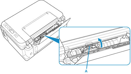 2. Draai de papierinvoerrollen (A) in de achterste lade meer dan twee keer rond en veeg ze af met een doek die u stevig hebt uitgeknepen na het vochtig maken.