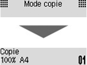 Lorsque vous appuyez sur le bouton COPIE (COPY), NUMÉRISER (SCAN) ou Configuration (Setup), l'écran passe en mode copie, en mode numérisation ou à l'écran du menu de configuration.