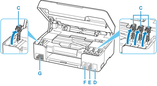 Open het tankkapje (C) van de inkttank die u wilt bijvullen.