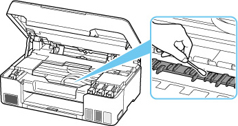 Om problemet kvarstår efter att rengöring har gjorts igen är eventuellt de utskjutande delarna inuti skrivaren smutsiga. Torka av eventuellt bläck från de utskjutande delarna med en bomullstops eller liknande.