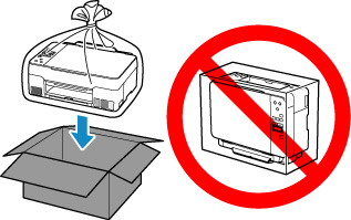 • Var försiktig och se till att lådan står rakt och INTE står upp och ned eller på sidan eftersom skrivaren kan skadas och bläck kan läcka ut från skrivaren.