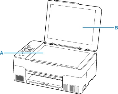 Använd en mjuk, ren, luddfri och torr trasa. Torka försiktigt av glaset (A) och insidan av dokumentluckan (den vita ytan) (B). Kontrollera att inga rester finns kvar efter rengöringen, i synnerhet inte på glasskivan.