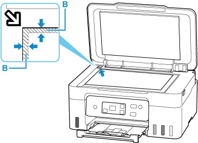 • A nyomtató nem tudja beolvasni a csíkozott területet (B) (1 mm (0,04 hüvelyk) az üveglap széleitől).