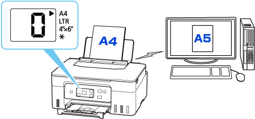例如,用于打印的纸张尺寸设置为A5,而LCD屏幕上的纸张尺寸设置为A4时,请在开始打印前装入A5尺寸纸张。