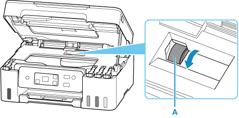 3. Miközben forgatja a hátsó tálca belsejében található laptovábbító görgőt (A), jól kicsavart nedves tisztítókendővel törölje át; a tisztítás során a görgő több mint két teljes fordulatot tegyen meg.