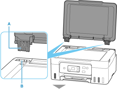 Sett begge hengslene (A) på dokumentdekselet ned i holderen (B), og sett inn begge hengslene til dokumentdekselet loddrett.