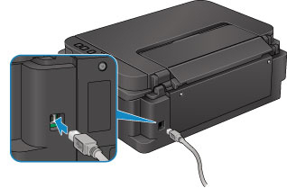 Ja iestatāt bezvadu LAN savienojumu vai maināt bezvadu LAN iestatījumus, izmantojot IJ Network Tool USB savienojumā, savienojiet ierīci un datoru, izmantojot USB kabeli, kā parādīts ilustrācijā zemāk. USB ports ir ierīces aizmugurē.