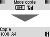 s'affiche sur l'écran LCD lorsque vous appuyez sur le bouton COPIE (COPY), NUMÉRISER (SCAN) ou Configuration (Setup), cela indique que la fonction Wi-Fi est activée et que l'imprimante est connectée au routeur sans fil.