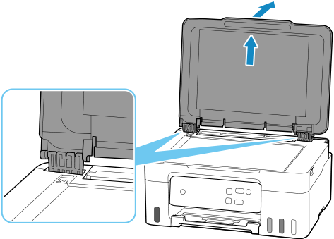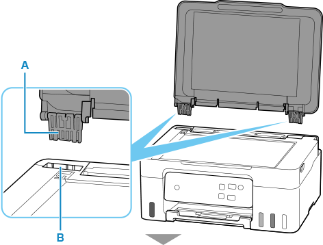 Sovita asiakirjakannen molemmat saranat (A) pidikkeeseen (B) ja työnnä asiakirjakannen saranat paikalleen pystysuuntaisesti.