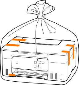 Estä tulostimen kansien aukeaminen kuljetuksen aikana kiinnittämällä ne teipillä. Pakkaa tulostin sitten muoviseen suojapussiin.