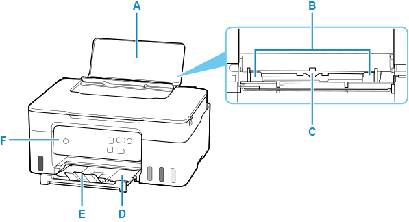 - Tulostettavat paperit tulevat ulos tästä. Vedä luovutustaso ulos ennen tulostamista.