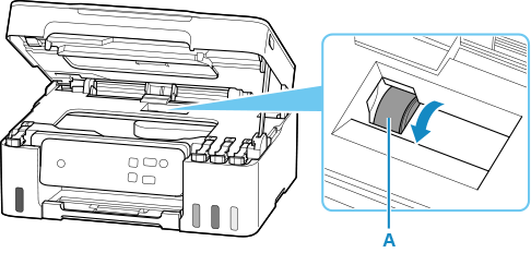 Trong khi xoay trục lăn nạp giấy (A) nằm bên trong khay sau hơn hai vòng, hãy lau trục lăn bằng khăn ẩm đã vắt kỹ.