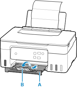 6. Kéo khay giấy ra (A) ra và mở phần mở rộng khay giấy ra (B).