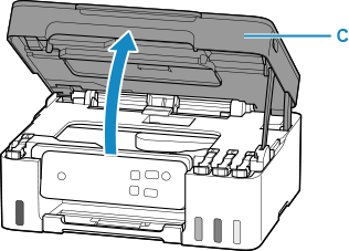 Nhấn mấu và mở nắp khóa đầu in (E).