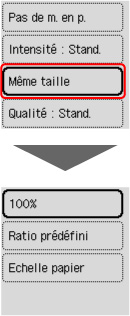 Lorsque vous sélectionnez Echelle papier, il se peut que le format de la page ne soit pas détecté correctement, selon l'original utilisé. Lorsque l'imprimante ne détecte pas correctement le papier, spécifiez l'agrandissement ou sélectionnez la copie à rapport prédéfini.