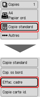 Appuyez sur le bouton OK sur l'écran d'attente de copie pour afficher l'écran des paramètres d'impression, puis sélectionnez Effac. cadre.