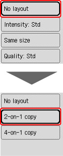 Premere il pulsante OK sulla schermata di standby di copia per visualizzare la schermata dell'impostazione di stampa, quindi selezionare Copia 2 in 1 (2-on-1 copy) in un layout da Altri (Others).