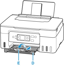 Izvlecite izhodni pladenj za papir (D) in odprite podaljšek izhodnega pladnja (E).