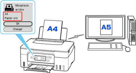 Par exemple, si le réglage du format de papier pour l'impression ou la copie indique A5 et que les informations sur le papier enregistrées sur l'imprimante indiquent A4, chargez du papier au format A5 dans le réceptacle arrière avant de lancer l'impression ou la copie.