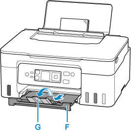 Tarik keluar tatakan keluaran kertas (F) dan buka perpanjangan tatakan keluaran (G).