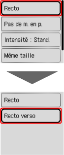 Appuyez sur le bouton OK de l'écran d'attente de copie pour afficher l'écran des paramètres d'impression, puis sélectionnez l'impression recto verso à partir de Autres.