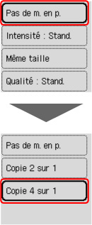 Appuyez sur le bouton OK de l'écran d'attente de copie pour afficher l'écran des paramètres d'impression, puis sélectionnez Copie 4 sur 1 dans une mise en page à partir de Autres.