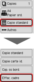 Appuyez sur le bouton OK sur l'écran d'attente de copie pour afficher l'écran des paramètres d'impression, puis sélectionnez Effac. cadre.