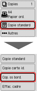 Appuyez sur le bouton OK sur l'écran d'attente de copie pour afficher l'écran des paramètres d'impression, puis sélectionnez Cop. ss bord.