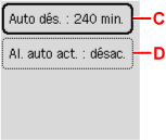 C: Spécifiez la durée au terme de laquelle l'imprimante se met automatiquement hors tension lorsqu'aucune opération n'est exécutée ou qu'aucune donnée d'impression n'est envoyée à l'imprimante.